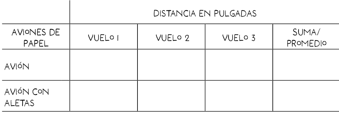 “Puedes usar el avión de papel que hiciste para probar qué tan lejos vuela ahora y qué tan lejos vuela después de que cambies su forma. Lanzarás el avión que hiciste tres veces. Una buena manera de organizar qué tan lejos vuelan los aviones cada vez es con una tabla de datos formada por columnas y filas. La palabra datos significa información. La información o datos que anotaras en tu tabla es la distancia que vuela cada avión. Las tablas pueden ser útiles cuando queremos comparar datos”.